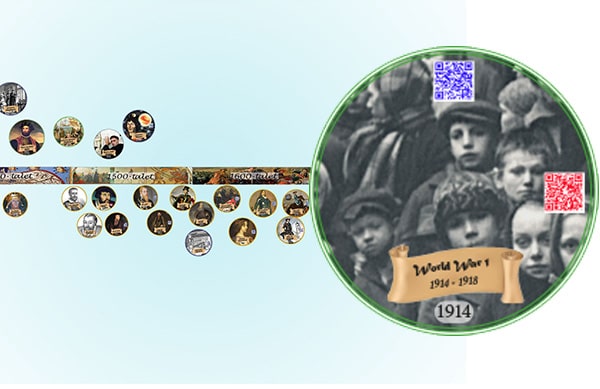 A timeline with QR-codes. The blue will take you to YouTube documentaries about historical events. The red ones lead to 360 movies. By placing a Google Cardboard VR-box on the wall, the students can scan the QR-code, place the mobile phone in the cardboard box and enter different museums, historical places and movies.